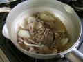 - 別容器の玉ねぎを入れて、灰汁を取りつつしばらく煮込む。