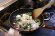 - ゴーヤの香りがたってきたら、木綿豆腐を手で崩しながらいれます。豆腐を崩すようにしてそのまま炒めます。