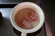 豚バラ肉の方には水500cc+日本酒10cc+生姜2枚。魚ダシの方は水1000cc+日本酒40cc+ネギの青い部分+ダシ昆布+生姜スライス3枚を入れて強火で沸騰させる。 - 途中出てくる灰汁を丁寧にとる。灰汁が出なくなったら、魚ダシの方に鰹節を入れてそのまま沸騰状態を2分ほど続け、濃いめの鰹だしをだす。