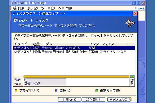 True Image が起動すると、接続されているディスクが表示されるので、コピー元を仮想ディスク、コピー先を物理ディスクに設定する。