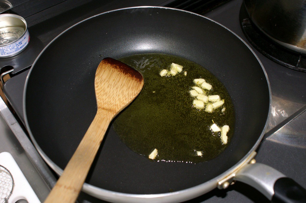 5. 残り3分になったらオリーブオイルと大きめに切ったにんにくを弱火〜中火で炒めます。にんにくに色が付き始めたらベーコンと海鮮類を中火で炒めます。にんにくは炒め終わったら取り除いておいてもOKです。所詮風味づけなんで。
