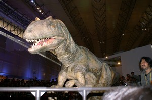 最後にアロサウルスです。会場を動き回るアレです。これは人混みが凄くてとても辛い体勢で見続けることになりました。これはスゴイ!!ケータイで動画を一生懸命撮っていたつもりなのですが、設定がしょぼくて 2MB になると保存しますかといちいち聞いてきたり、動画を撮っていると思ったら全然撮れてなかったりとかかなり残念無念。