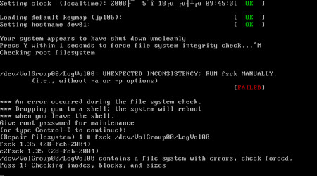 で、ファイルシステムに整合性がなくなった状態になると Linux 起動時にエラーで止まります。ext3 とか使っていてジャーナルファイルだけで何とかなる場合には自動修復して起動するわけですが、より派手に壊れるとダメなわけです。