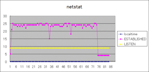 netstat の ESTABLISHED,LISTEN,TIME_WAIT のグラフからコネクション状況を把握します。