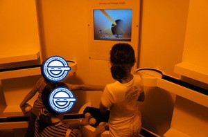 こちらは光のお勉強をする装置です。通常の光とは異なり、ナトリウムランプという特殊な光源を使うと様々な色のボールが同じ色に見えてしまう体験をします。そもそも物体の色というものは自分で発光しない限り、照らされた光を反射することで色を示すことができません。ナトリウムランプは他の色がまったく混じっていないオレンジ一色なので、様々な色のボールが同じ色に見えますが、蛍光灯で照らすと本来の色をみることができます。ボールの色分別をするクイズ形式になっているのですが正解率はかなり悪かったです。