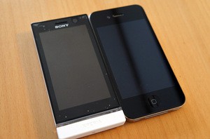 さて ST25i の外観です。個人的な印象として iPhone をかなり意識したサイズになっているのでは?と感じました。iPhone と比較して縦の長さは若干長く、幅は若干狭い程度。横から比較すると厚みは iPhone より結構厚みがあることがわかりますが、背面が湾曲していてグリップ感は iPhone より寧ろ良いです。