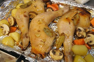 1時間たったらオーブンを200℃に暖め始めるとともにローストの準備に入ります。下味調味料で味付けしたお肉とお野菜をアルミ箔を敷いた鉄板の上に並べ、じっくり200℃で1時間ほどローストします。