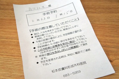 そうこうしているうちに手術の時間が近づいてきました。なんだかソワソワしてきたので、ちょっと早めに病院へ足を運びました。さすがに名医だけあって本日もお昼休みの 13:00 - 14:30 の間に3件の手術があるようです。僕が一番最後。診察券と予約表を渡すと、きっかり 13:15 に名前が呼ばれました。