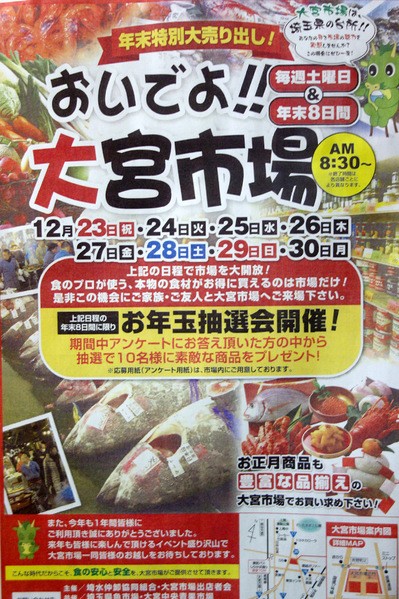 大宮近辺にお住まいの方、大宮市場はちょうオススメです。年末は 28, 29, 30 日と開いてるので明日と明後日、気になる方は AM8:30 に行ってみてはいかがでしょう?スーパーでは手に入らない掘り出し物が見つかると思います!