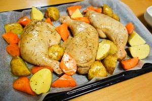 付け合せの野菜は人参とじゃがいも。これもいろいろ試してきましたが、この組み合わせが一番うまい。香りオイルと照り焼きソースをしっかりからめて、オーブンで45分じっくりと火を通します。25分後、35分後に一度取り出して照り焼きソースを塗りたくり味付けします。