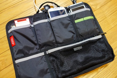 実際にガジェットを入れてみた感じも、一見すると凄く良さそうな感じに見えますが、このインナーバッグも側面に骨が無いため、もの凄いヘニョります。この状態でバッグをたてると半分にペタンと折れ曲がってしまい、鞄の中に入れると取り出しづらいというレベルを超えて、知らない間にガジェットが飛び出してバラバラになってしまってます。このバッグに点数をつけるとしたら、完全に0点ですわ。
