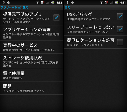 - Android Gingerbread: 設定 > アプリケーション設定 > 開発 > USBデバッグ