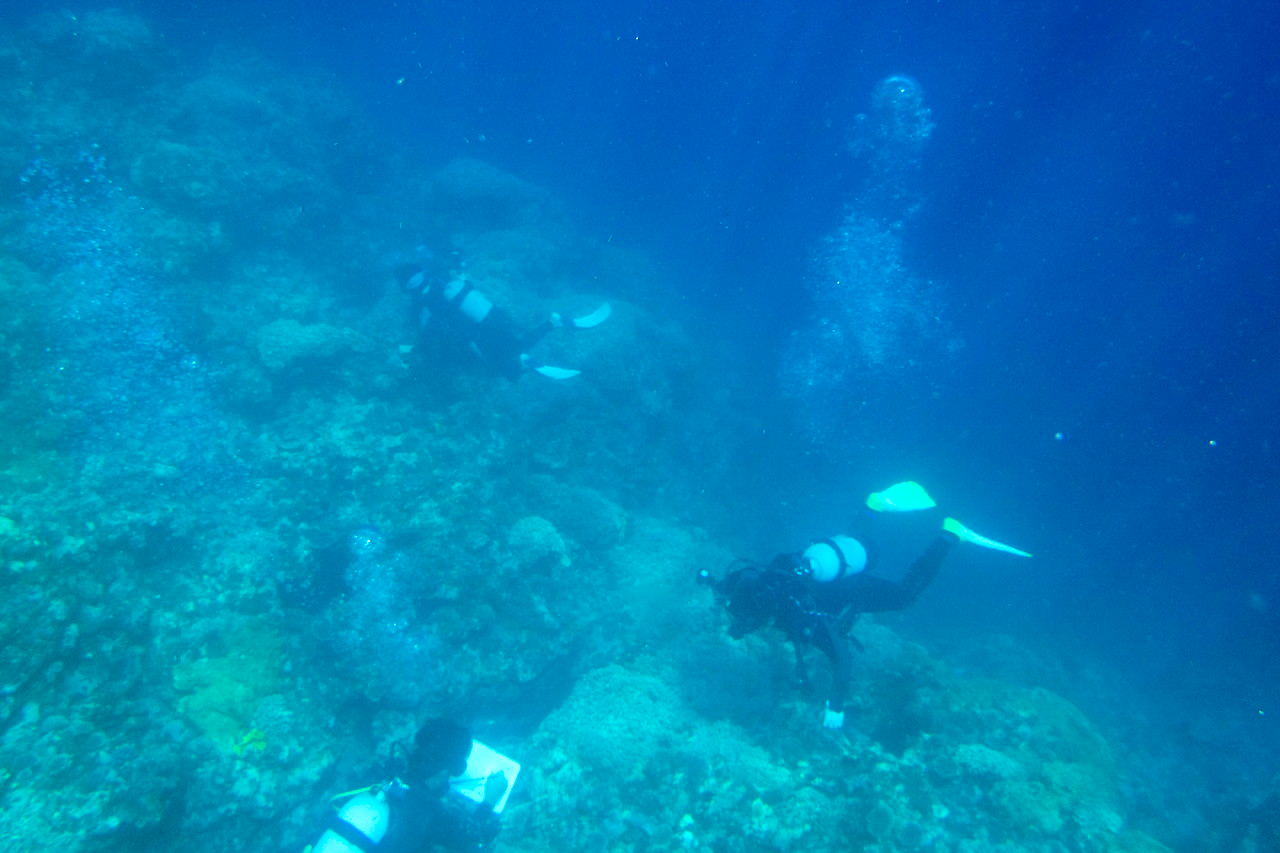 リーフの際って言っても、よくわからないかもしれませんが、水深 2m 程度までの珊瑚礁の海から世界が変わります。リーフの際ではダイビングの講習が行われるような深さに変わる場所なので、しっかりした装備がなければアウトなところです。実際ダイビングの講習会が行われていて手も降ってくれましたよ。