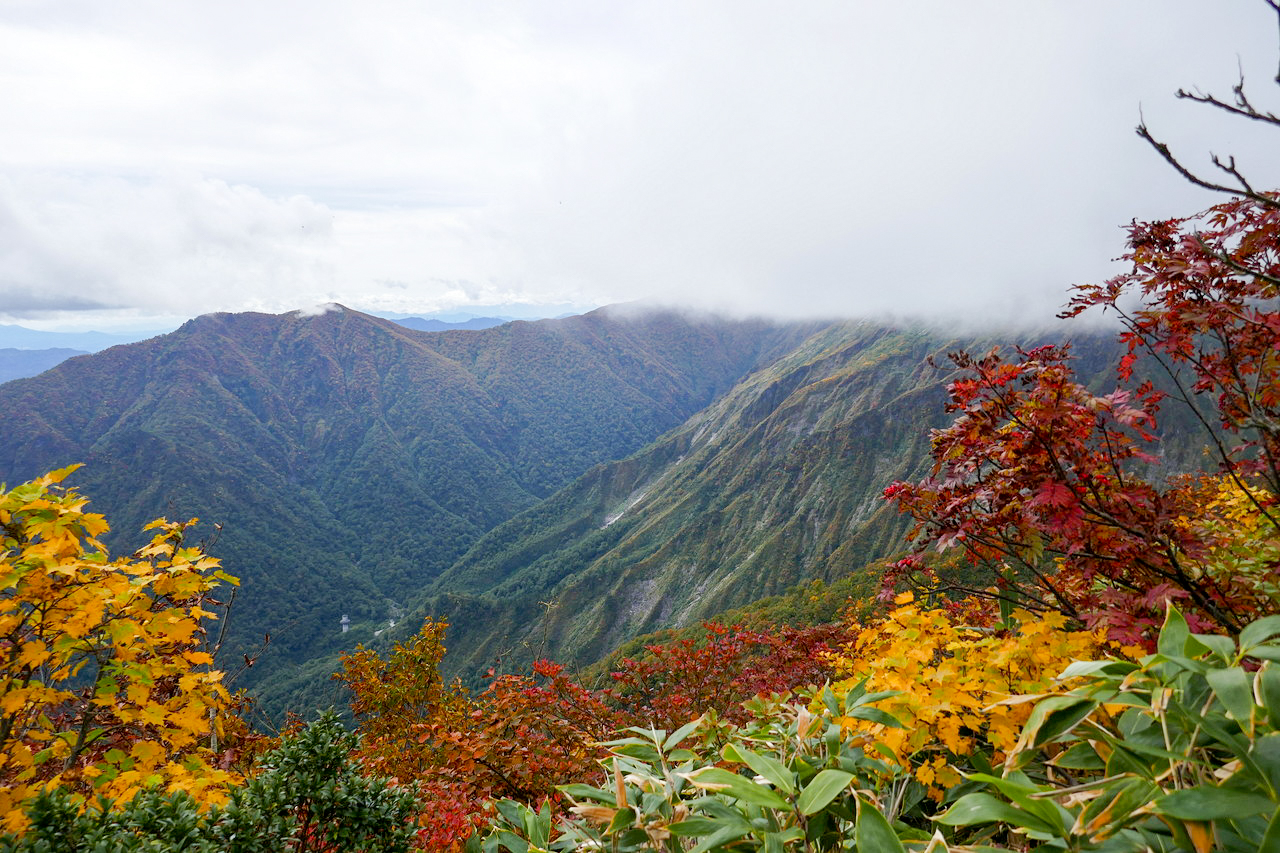 運が悪かったのか、何なのか、下ってるうちにガスが晴れてきました。とにもかくにも追い抜くことはできず自分だけ急げないので、紅葉をなるべく楽みながら歩きます。