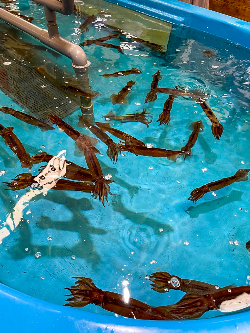 泳いでいるのは小さめのスルメイカ。疑似餌で耳の部分を引っ掛けて釣り上げる。体験料は変動価格なのか、1,000 円払った記憶があるそうなのだが、この日は 600 円だった。