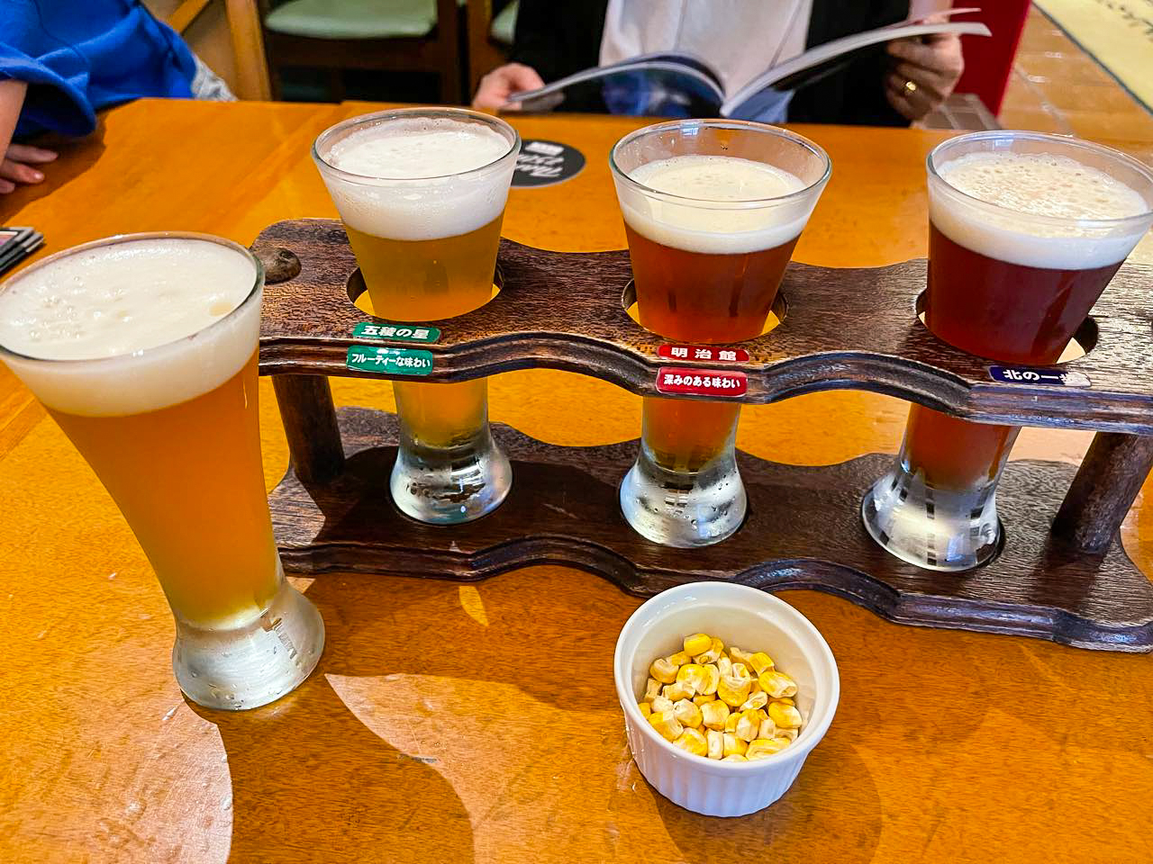 雨が降ったり止んだりと、天候には恵まれず、加えて函館に着いてから謎の鼻炎症状で体調はすこぶる悪かったが、とりあえず観光続行。地ビールの飲み比べを体験すべく HAKODATE BEER に足を運んだ。店内の雰囲気はなかなか良い。