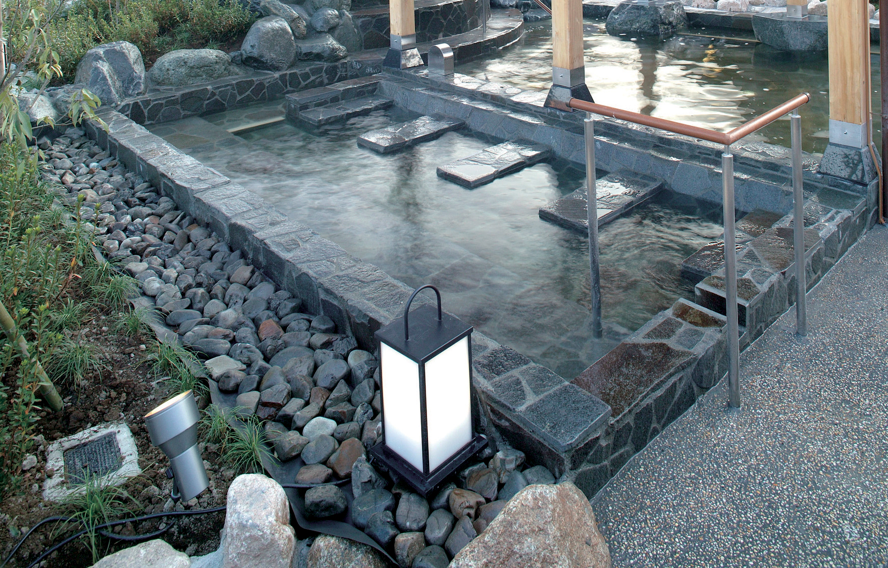 「露天風呂:岩風呂」は源泉湯が階段を伝って冷まされた湯となり適温で長湯しやすい。