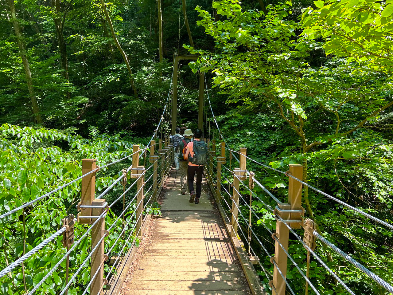 人気の吊橋。撮影するために足を止める人がそれなりにいた。ここらへんから川の音を聞きながら歩みを進めることができるのだが、癒やされる環境音って大事だなと感じた。