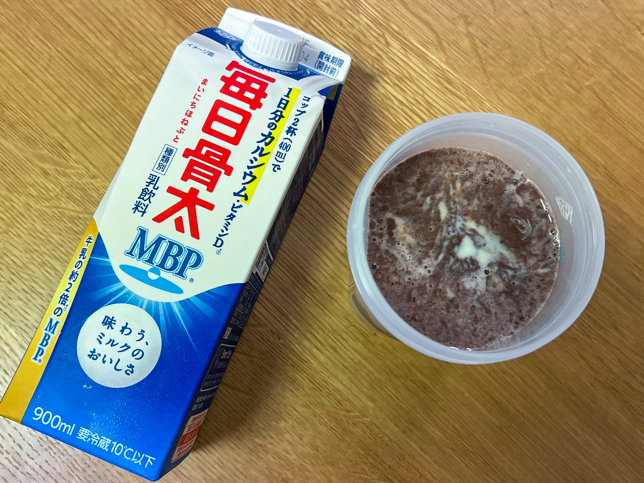 今までは水で飲んでいたプロテインを、買ってきた毎日骨太にとりあえず混ぜてみたところ、脳がスイーツと認識するようで美味しく飲めたので自分自身驚いた。